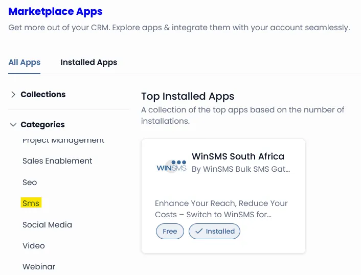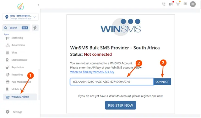 Install the "WinSMS South Africa" Marketplace App from the "App Marketplace" link in your platform.